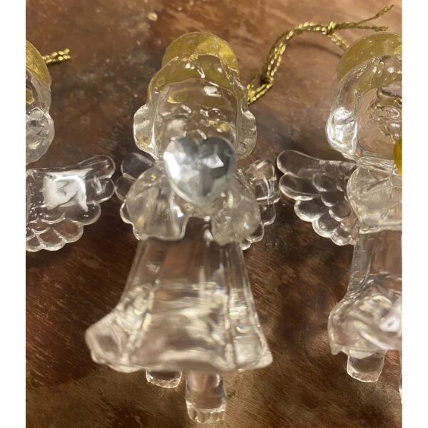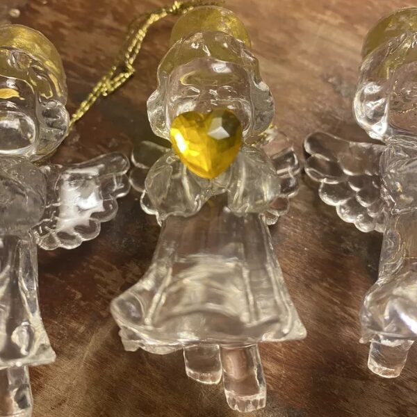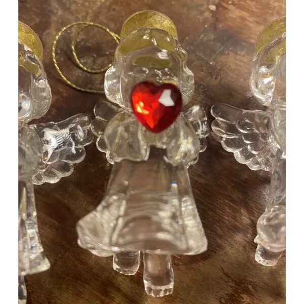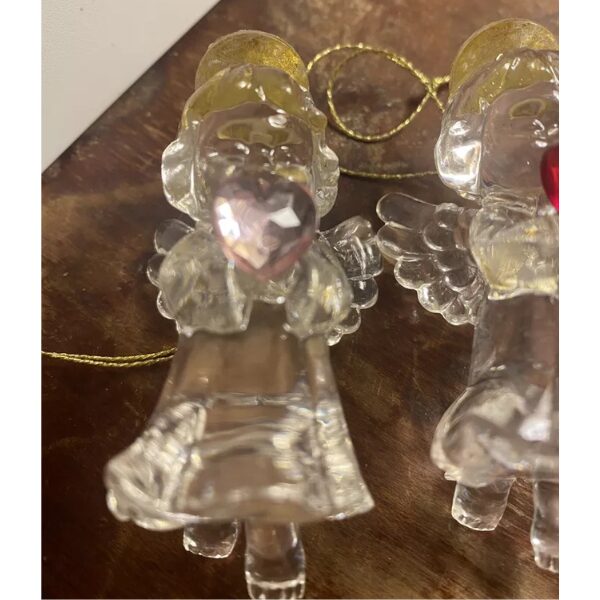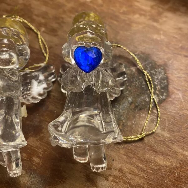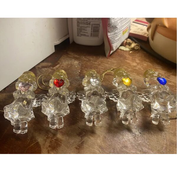 This Angel set has 5 angels, all 5 kneeling and each one has a different color heart. Pink, red, yellow, white, and finally blue. The angels are clear with their colored hearts and gold string hangers. A used set but still a nice one.