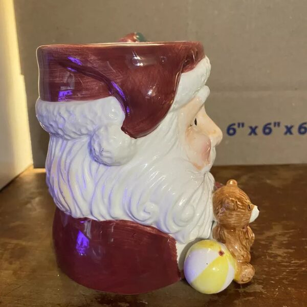 This Santa mug is a nice collectible cup. It is ceramic with ole St. Nick himself as the theme. He has a bear, a present, and a tree with him as well as a candy cane handle. A new mug without a box. A great gift this holiday season.