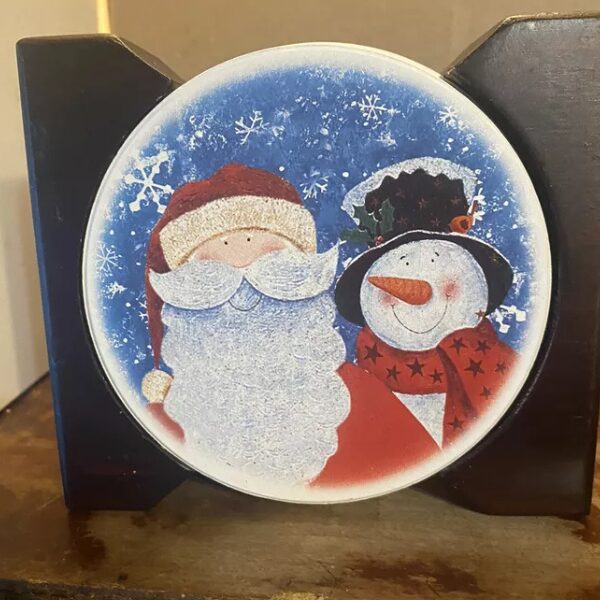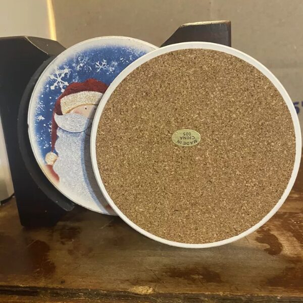 This 4 piece coaster set has four cork backed coasters with Santa and a snowman on the front which is made of ceramic/porcelain. They come with a wooden frame for storage. They are used with a little ware but still are good enough to use.