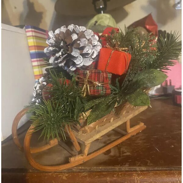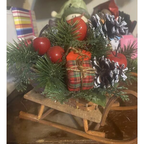 This cute little sleigh is decorated with fake pine, red plastic apples, white topped pine cones, and red plaid packages. It’s arranged to make a nice tabletop piece of decor or a centerpiece. The choice is yours.