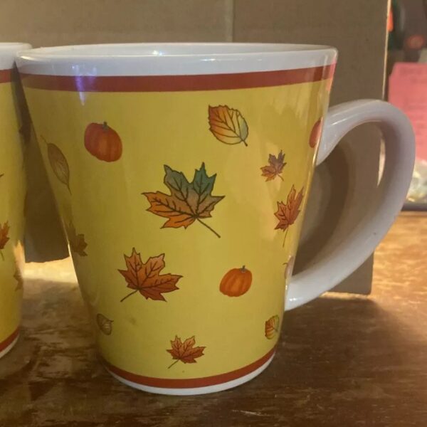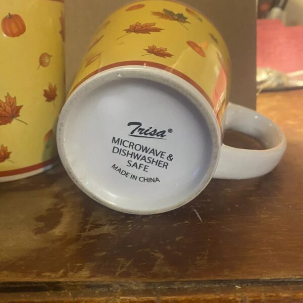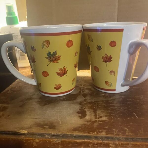 These coffee mugs are a matching set of two. They are dishwasher and microwave safe and are decorated with leaves for the fall season. They are 4.25” tall and 3” wide. They hold 12 fluid ounces. A used set but a nice set. Good for hot or cold drinks.
